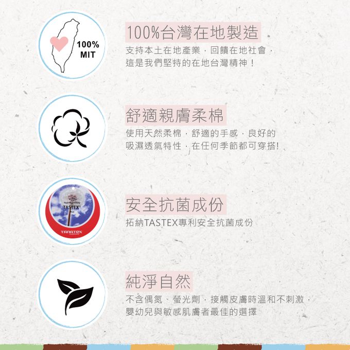 材質100%純棉,不含偶氮、螢光劑