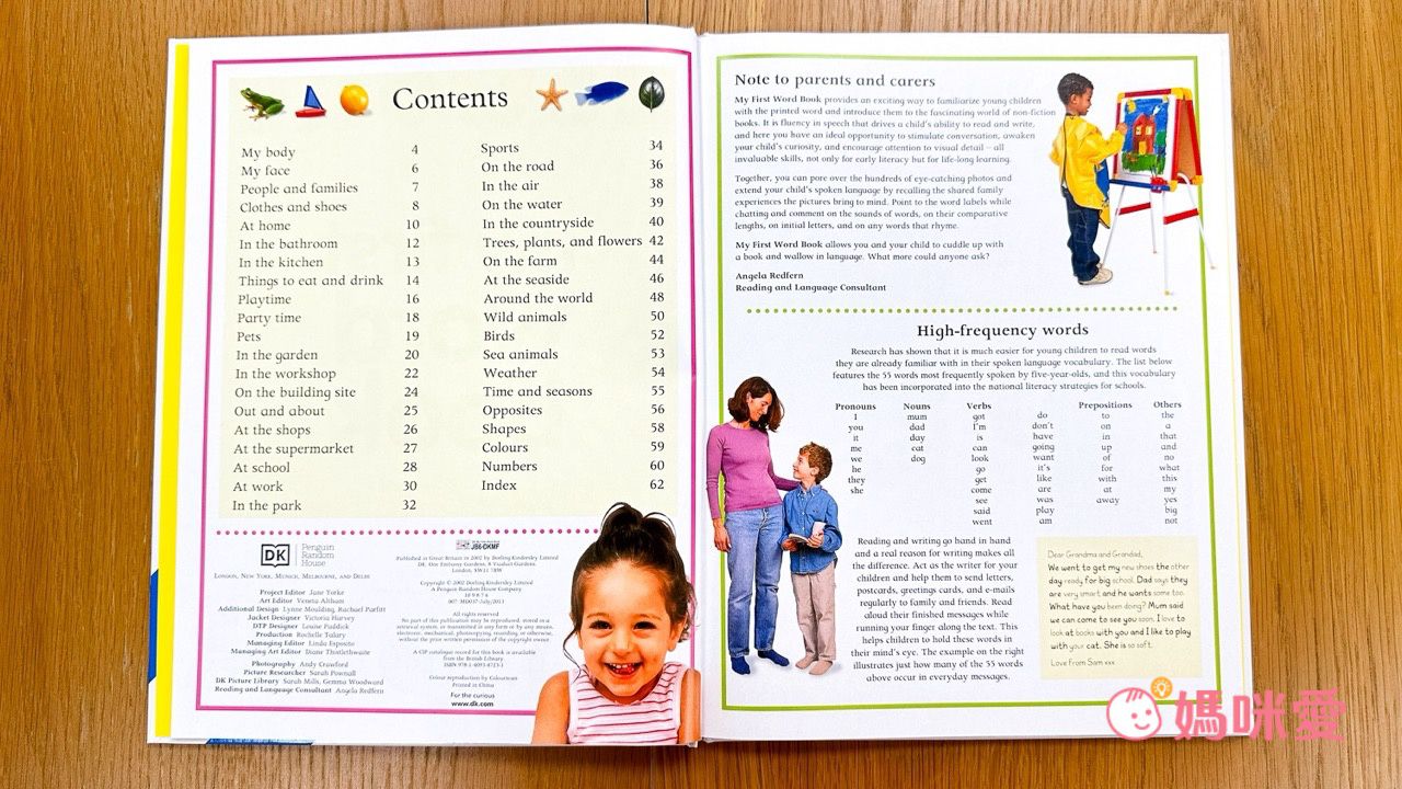 從目錄就可以知道內文有多豐富了:從身體、家庭、公園、學校、運動、形狀、數字、顏色等幾十種日常主題,連結幼兒生活經驗,甚至包含小學階段所有必學詞彙,搭配配樂節奏,打破枯燥學習~!!