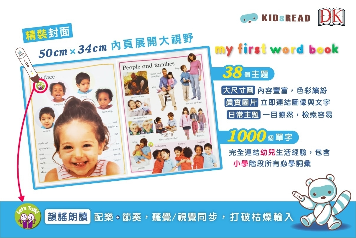 這本很適合當作給孩子的第一本英語點讀書。因為我家兩個孩子都唸公幼,學校沒有英語課程,英語點讀筆就是讓他們接觸第二語言的大幫手!書本內容以千張生活化的真實圖片呈現,加上自己很喜歡尺寸超大的書,感覺能減少幼兒閱讀及翻閱的困難度!