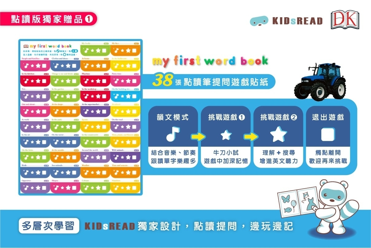 貼紙上有音樂節奏結合單字可以跟讀、有牛刀小試邊玩邊記憶、增進英文聽力各項互動遊戲。能閱讀又能玩小遊戲,誰不愛><