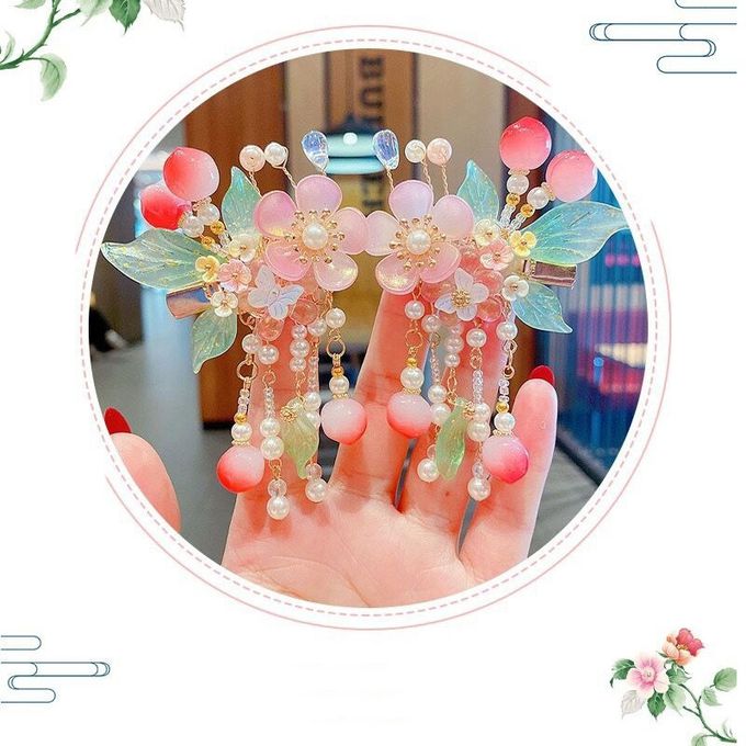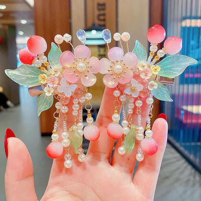 古色古香蜜桃粉嫩金粉花朵吊墜髮飾對夾