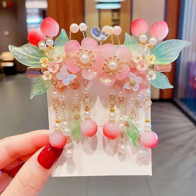 品名:古色古香蜜桃粉嫩金粉花朵吊墜髮飾對夾