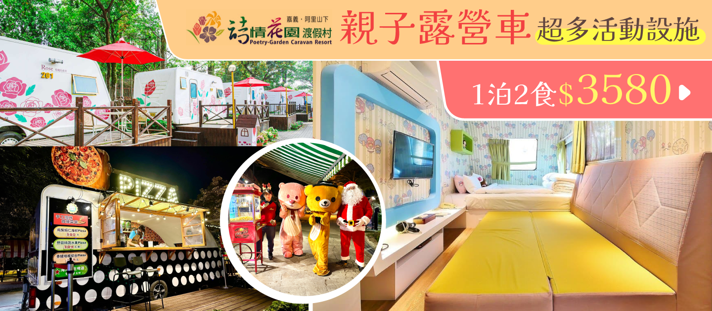 這次帶著家人來到【嘉義詩情花園渡假村】,詩情花園渡假村主打露營車住宿的懶人露營,露營車擁有獨立的休息及衛浴空間,輕鬆愜意親近大自然的同時擁有飯店舒適的享受,還有豐富的活動及設施,兒童遊戲室、沙坑,腳踏車免費租借,披薩DIY、親子高爾夫球,假日晚間還有煙火秀放天燈及爆米花...等等,超適合親子同遊!
