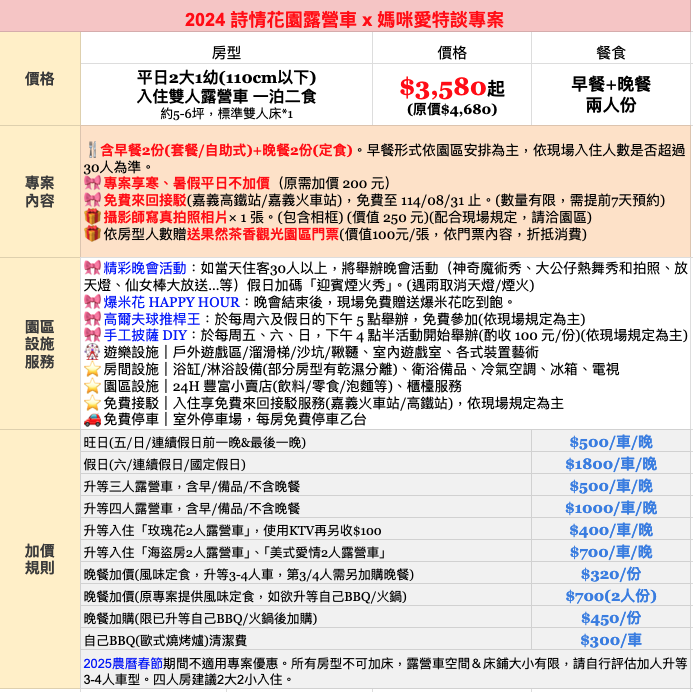 註:其他房型升等:因露營車空間、床鋪大小有限,雙人露營車建議2大1幼入住,四人露營車建議2大2小入住。(超過專案人數,建議加人升等3-4人房)升等3人露營車(含早/備品/不含晚餐),加價$500/車/晚;升等4人露營車(含早/備品/不含晚餐),加價$1000/車/晚。