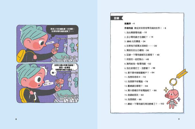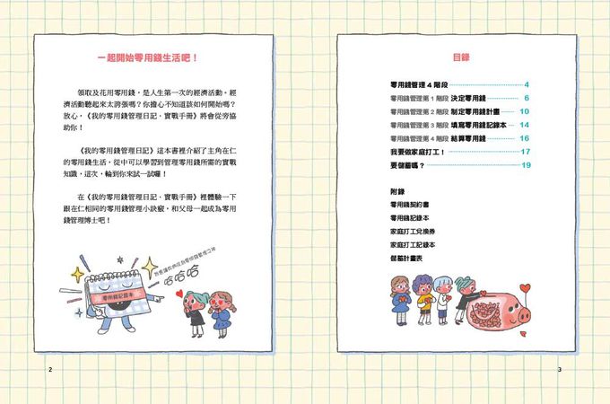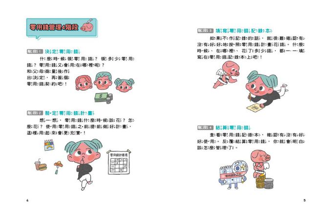 書中內容包含:「多少零用錢才合適呢?」、「250元的價值」、「買朋友的生日禮物」、「記錄一下零用錢都花在哪裡?」、「我在家裡打工,怎麼樣?」……等17個主題,透過漫畫式情境引導,用實例讓孩子了解如何制定零用錢金額及零用錢計畫、規劃零用錢使用的優先順序、支出零用錢時要考慮的問題,以及記錄花費明細的技巧等,更鼓勵孩子可用協助家務的方式來賺取零用錢,同時也用各種日常生活中會遇到的金錢使用狀況情境,來幫助孩子對金錢有更多認識。