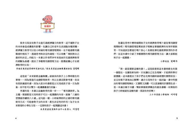 「對,就是需要這樣的書!」這是我看到這本書時產生的第一個想法。在獲取新知時,只有讓自己完全理解,才能將所學付諸實踐。這本書提出了孩子們在花零用錢時會經歷的實際狀況,並且有條不紊地加以解釋,適合父母和子女一起討論。書中所提出的零用錢管理辦法,又實際又具體,可以直接應用於實際生活,是一本適合親子共讀,幫助掌握經濟概念的最佳書籍。如果我的孩子小時候就有這樣的書,那該有多好啊!