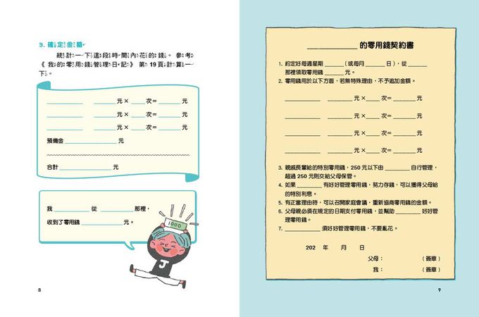 是一本可以讓孩子自己管理零用錢的練習冊。書中附錄有:「零用錢契約書」、「零用錢記錄本」、「家庭打工兌換券」、「家庭打工記錄本」、「儲蓄計畫表」,讓孩子在閱讀過管理日記後,可以更便利地直接進行實際演練,快速訂定計畫,與父母一起互動管理零用錢。