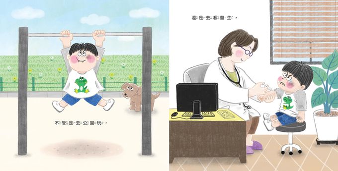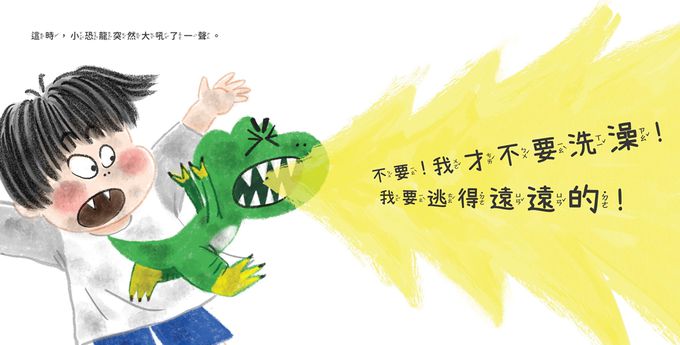 去哪裡都穿著恐龍T恤的小男孩,T恤上的小恐龍就像他的化身,陪他一起上學、看醫生,陪他一起開心和害怕。比起總是強制要孩子去做什麼的大人,大喊「我最討厭洗澡了!」的小恐龍,彷彿喊出了孩子真正的心聲,閱讀時不知不覺就能同理孩子還想繼續跟朋友玩耍的心情。
