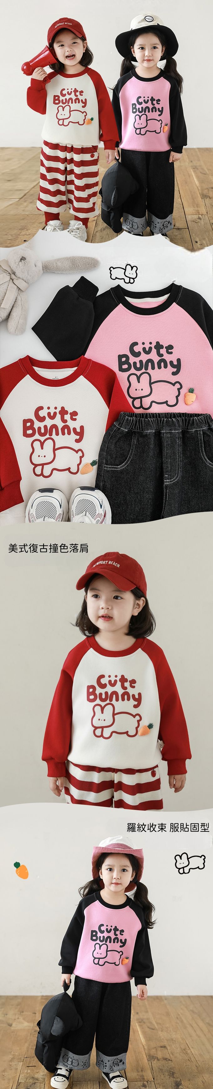 撞色拼袖長袖上衣/大學T-兔子拔到立體紅蘿蔔-粉色