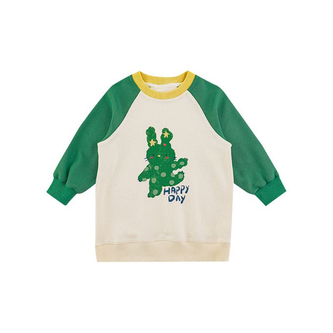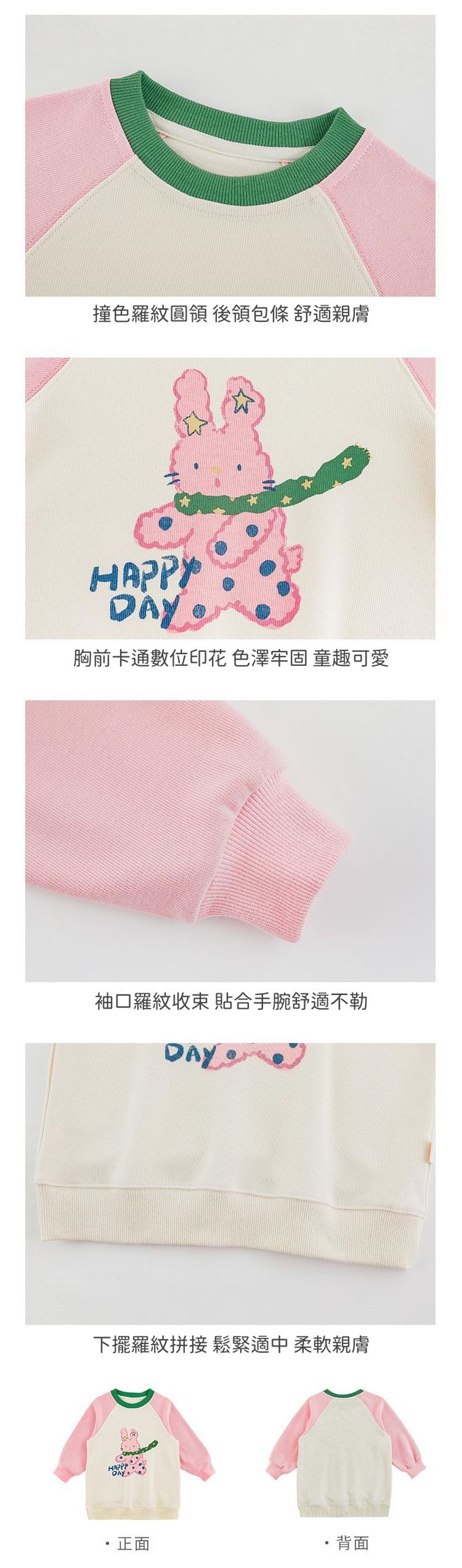 中長款圓領撞色長袖上衣-雲朵兔兔-綠色