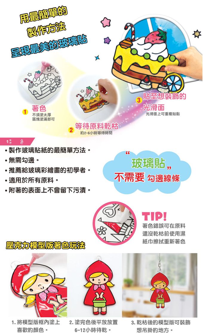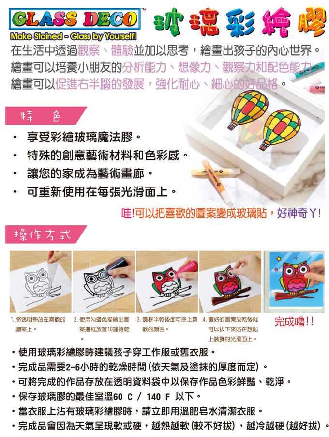 •使用玻璃彩繪膠時建議孩子穿工作服或舊衣服。