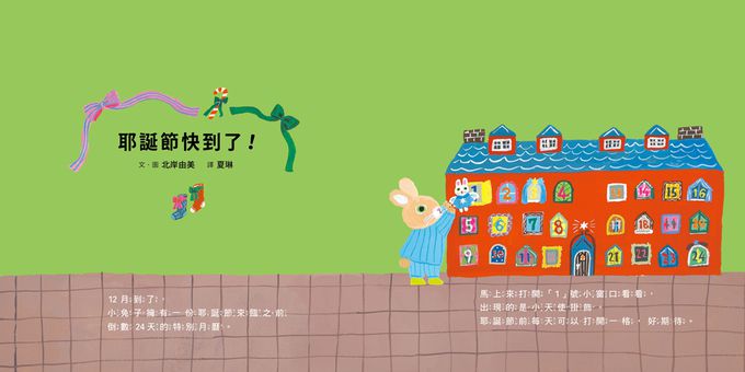 貫穿全書的倒數月曆結合了教會傳統的「降臨曆」,在設計精美的小格子中每天揭示一個小小驚喜,增添了閱讀的趣味。這本繪本不僅讓孩子彷彿跟小兔子一樣擁有了一本特殊的月曆,倒數的方式也能在每一頁中激發他們對數字和日期的興趣,讓他們在閱讀中學習和期待每一天的到來。