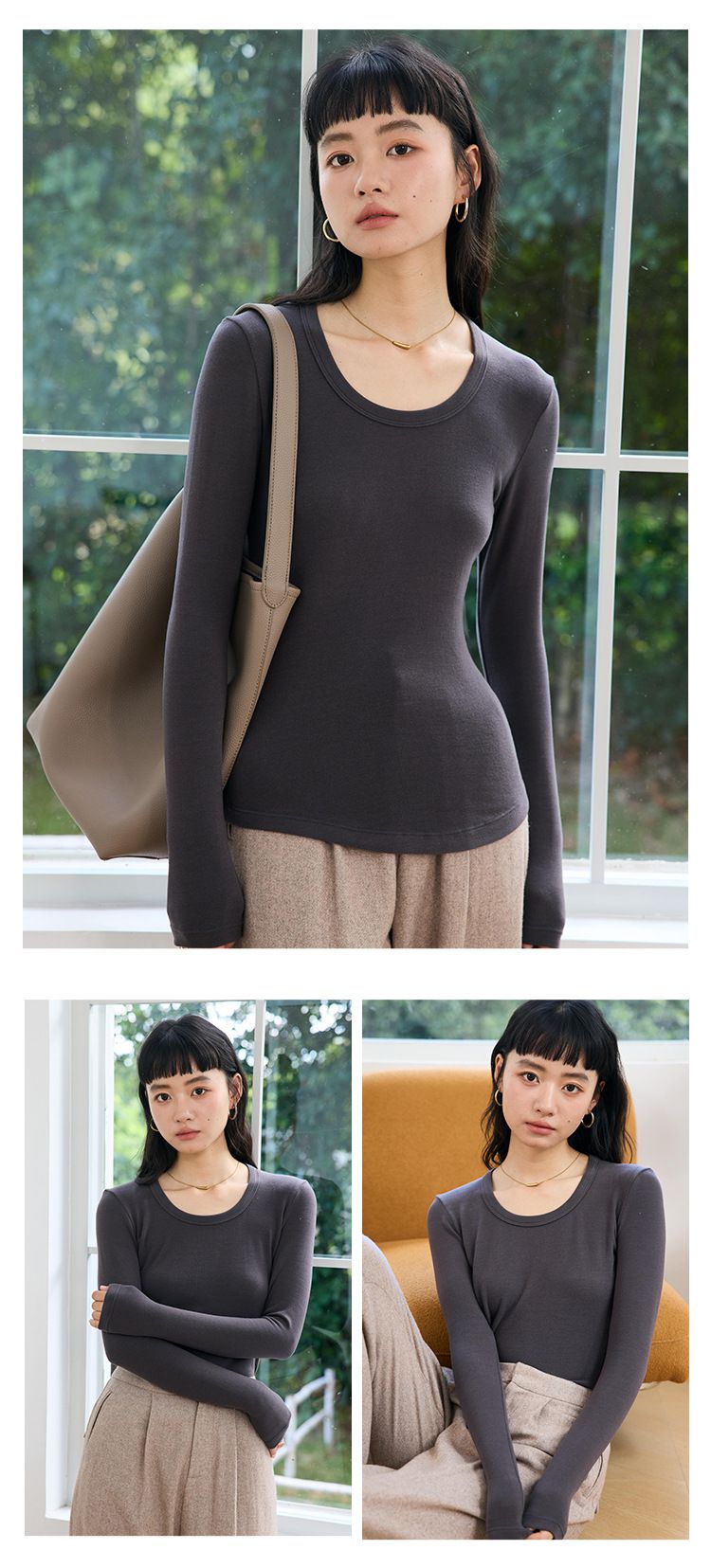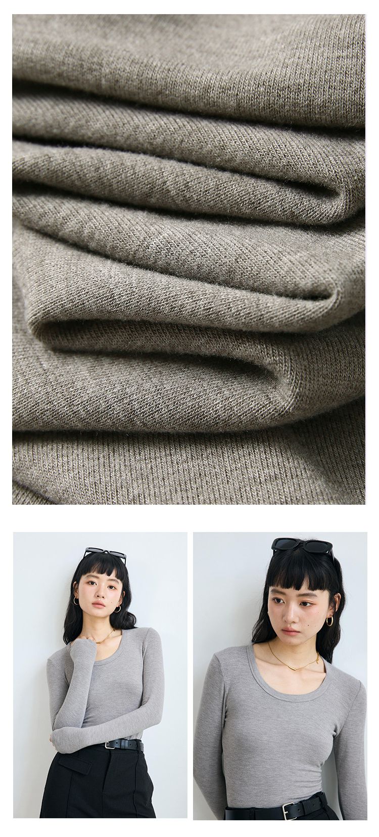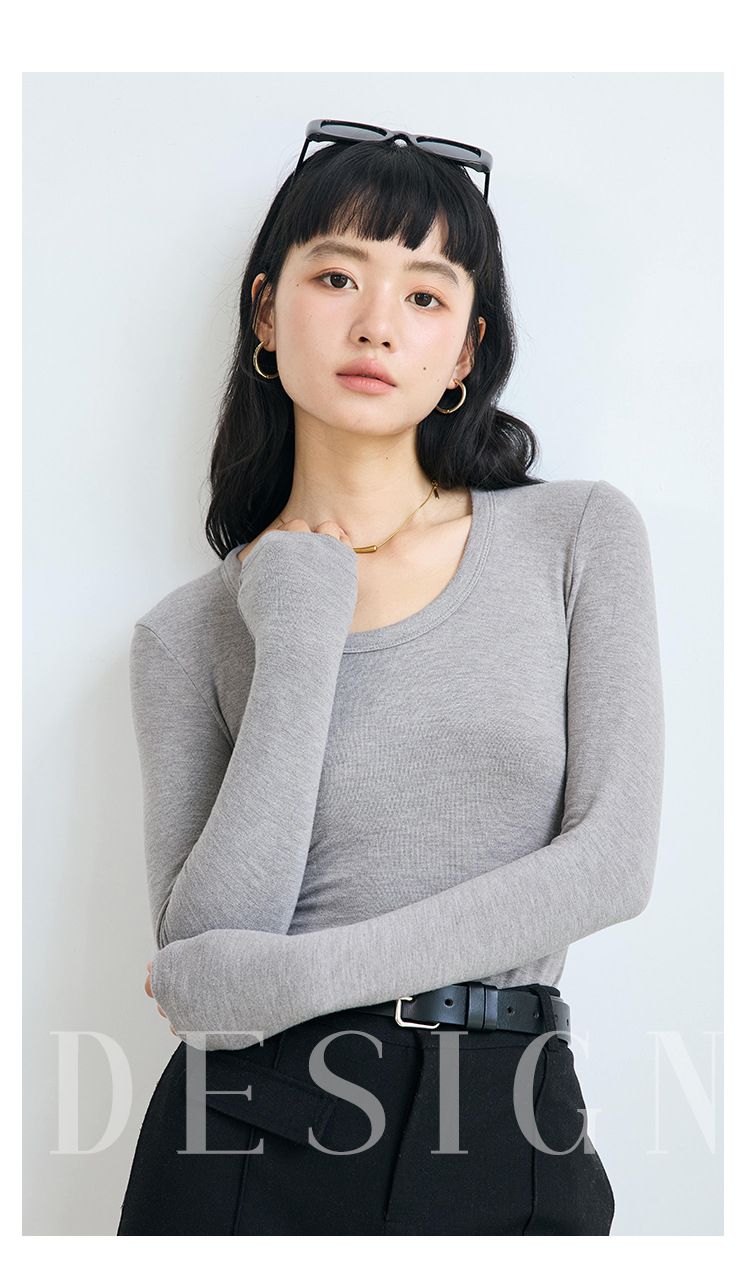 4.1%羊毛天絲修飾U領長袖上衣-原麻灰