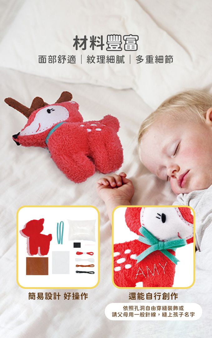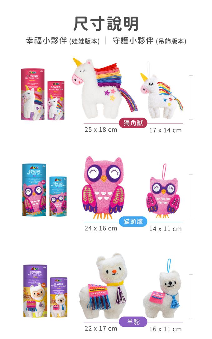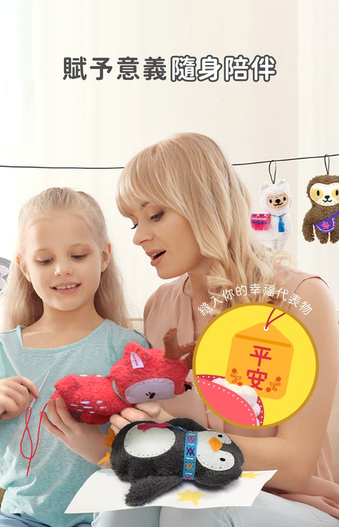 ※ 內容物:縫工材料包 (特色布塊、毛氈布塊、鈍頭安全塑膠粗縫針、棉繩、吊繩、填充物)