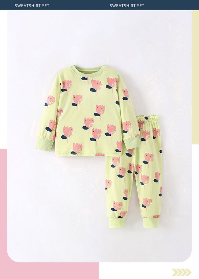 棉質圓領長袖套裝/家居服/空調服-粉鬱金香-黃綠色