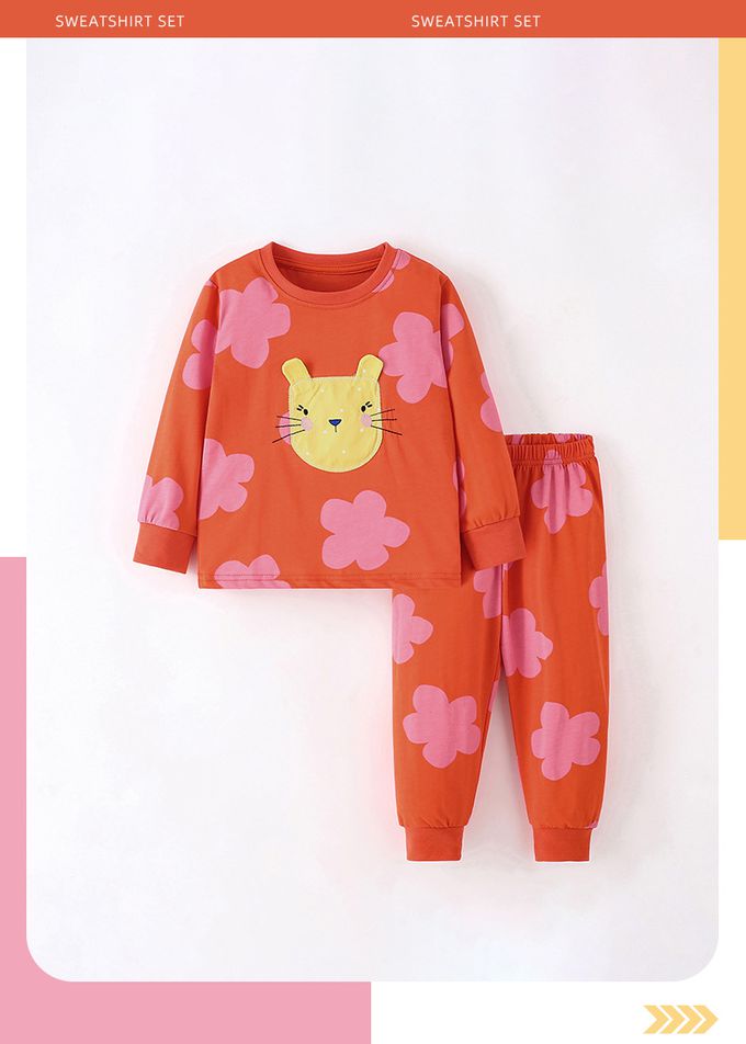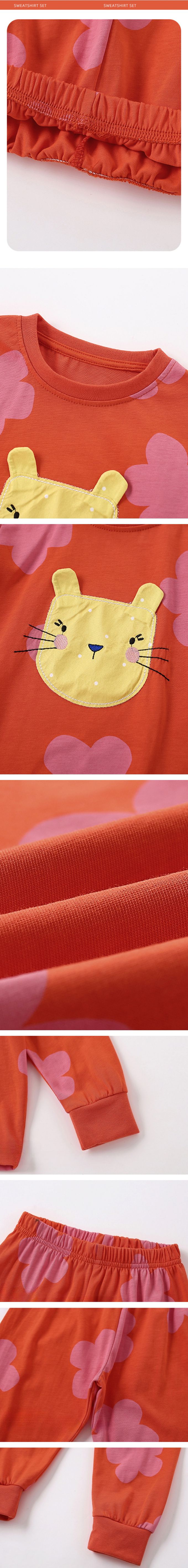 棉質圓領長袖套裝/家居服/空調服-喵喵花花-橘色
