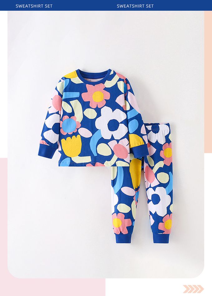 棉質圓領長袖套裝/家居服/空調服-滿版花卉-藍色