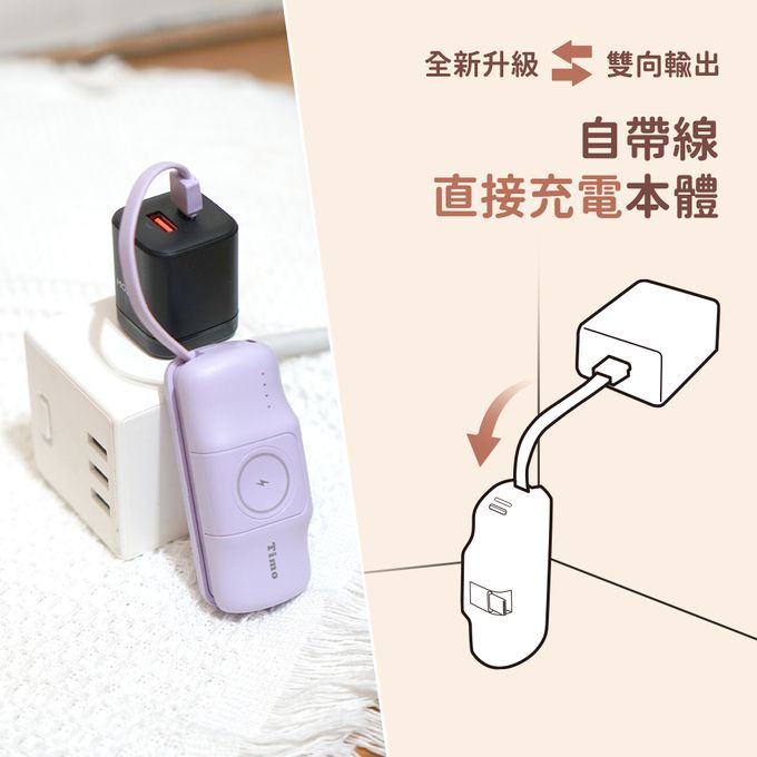 • 全新升級雙向輸出,使用自帶Type-C線為行動電源本體充電,達到真正出門不帶線