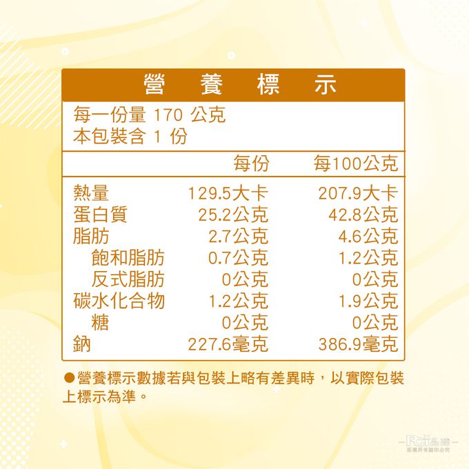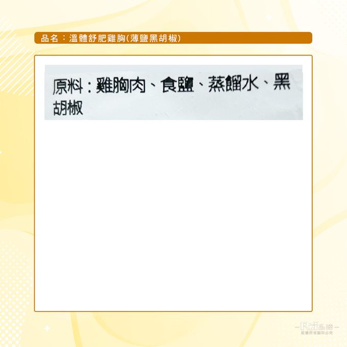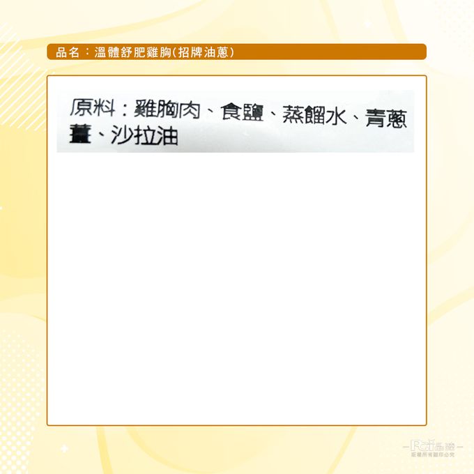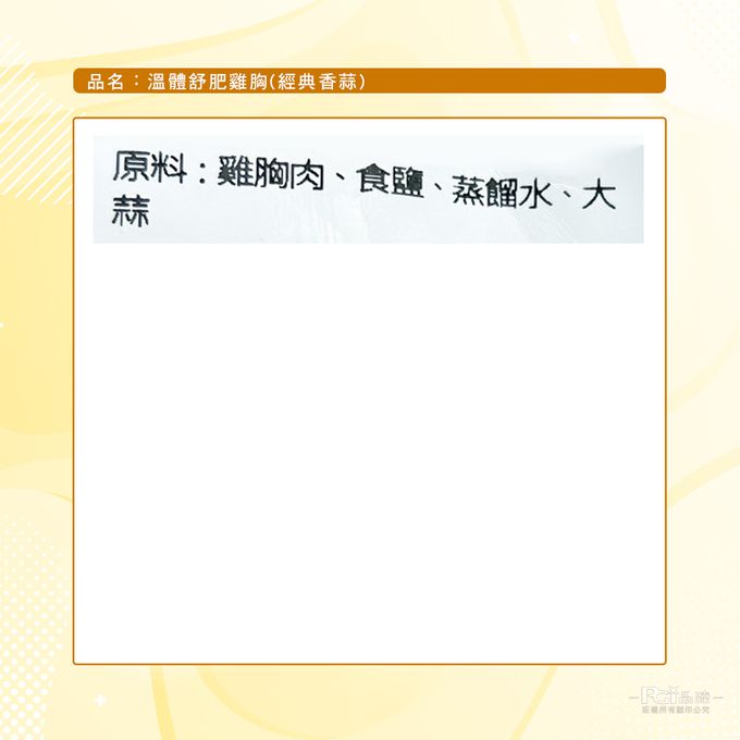 成分:招牌油蔥:雞胸肉、食鹽、蒸餾水、青蔥、薑、沙拉油 經典香蒜:雞胸肉、食鹽、蒸鰡水、大蒜 義式香料:雞胸肉、食鹽、蒸餾水、羅勒葉、洋香菜葉、迷迭香、皮薩葉 薄鹽黑胡椒:雞胸肉、食鹽、蒸餾水、黑胡椒