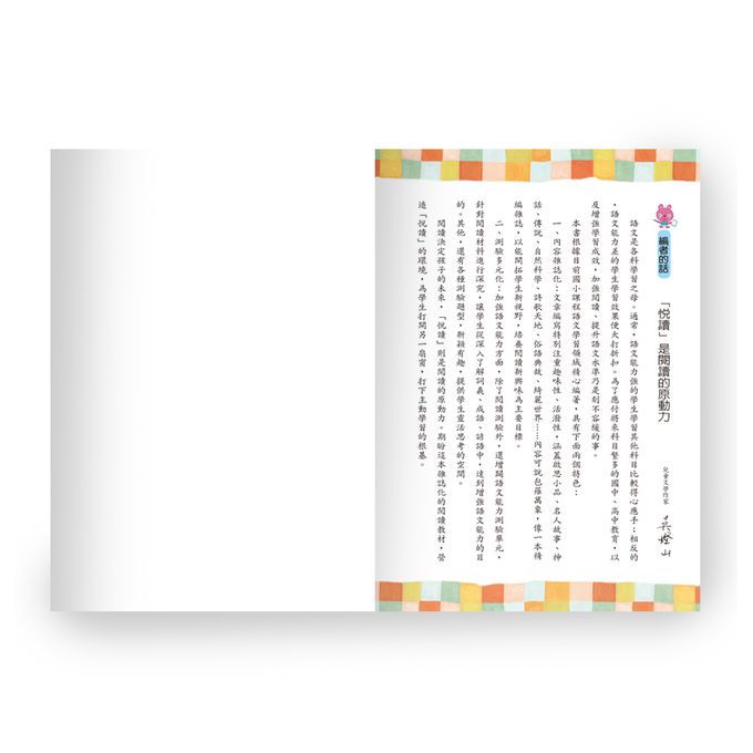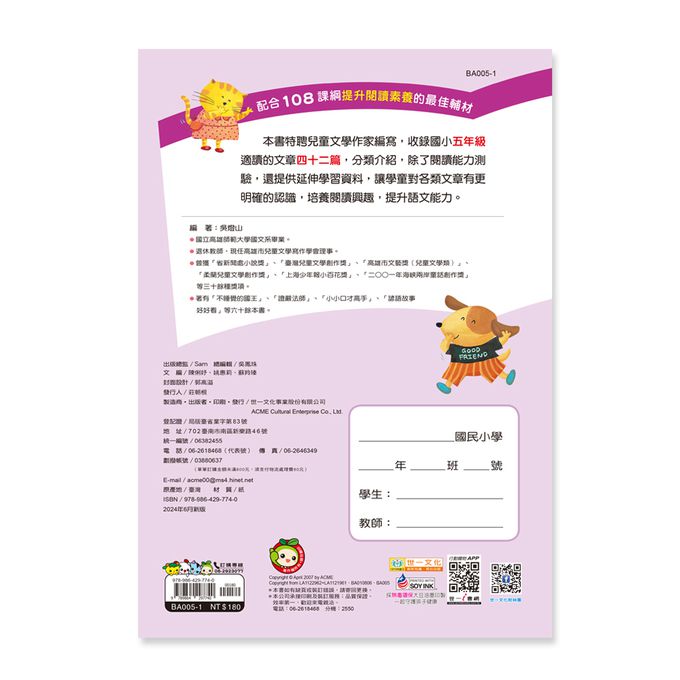 本書配合108課綱要領編寫,共收錄42篇包括啟思小品.名人故事.神話.傳說自然 科學.詩歌天地.俗語典故.綺麗世界.勵立志短文等不同類型的文章,題材多元化 活潑化;每篇文章除了閱讀測驗外,還有疊字成語.趣味字謎.擴寫句子.諺語填空 等語文能力測驗,讓孩子靈活思考,提升語文能力,累積閱讀實力.