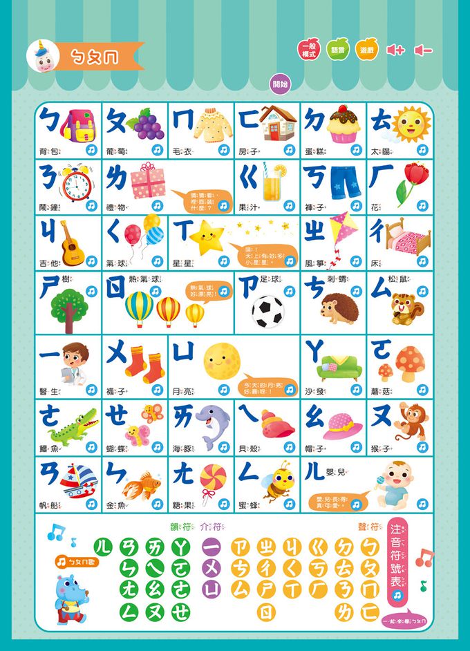 按下「語言」鍵,一鍵切換中、英、台三種語言模式,讓孩子從小接觸標準的三語聽力與口說,建立正確語言觀念。