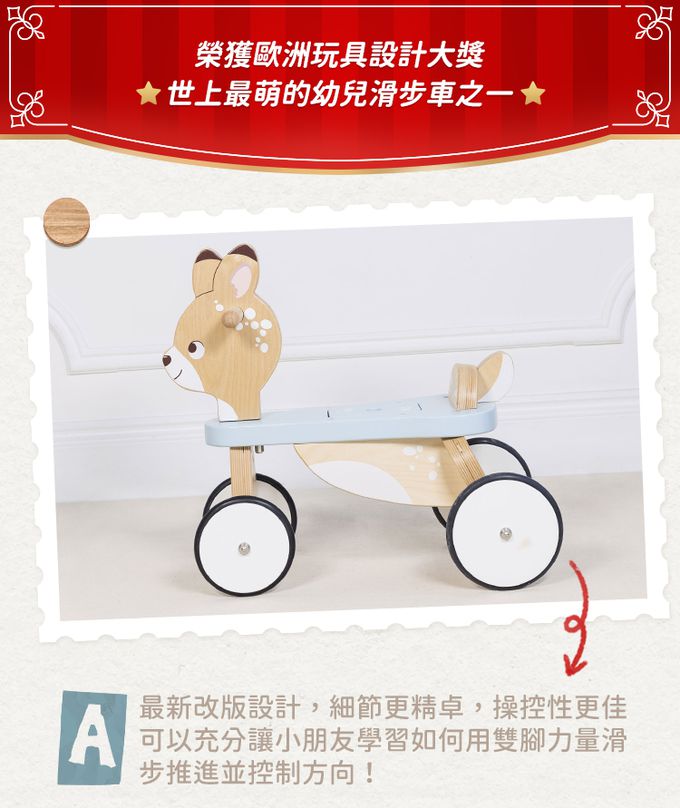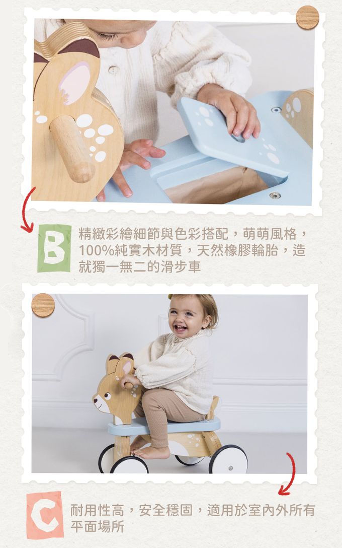。精緻彩繪細節與色彩搭配,萌萌風格,100%純實木材質,天然橡膠輪胎,造就獨一無二的滑步車