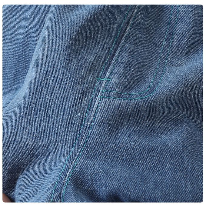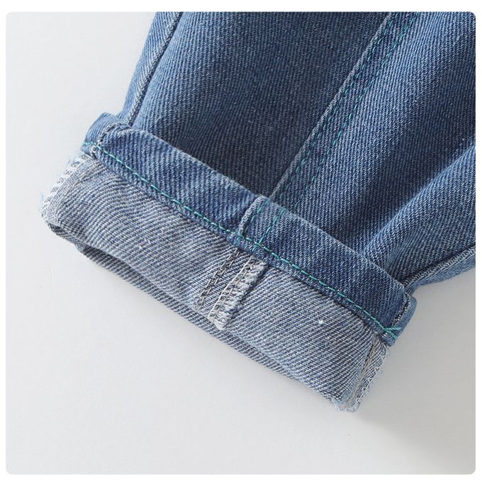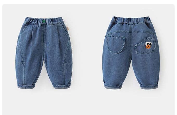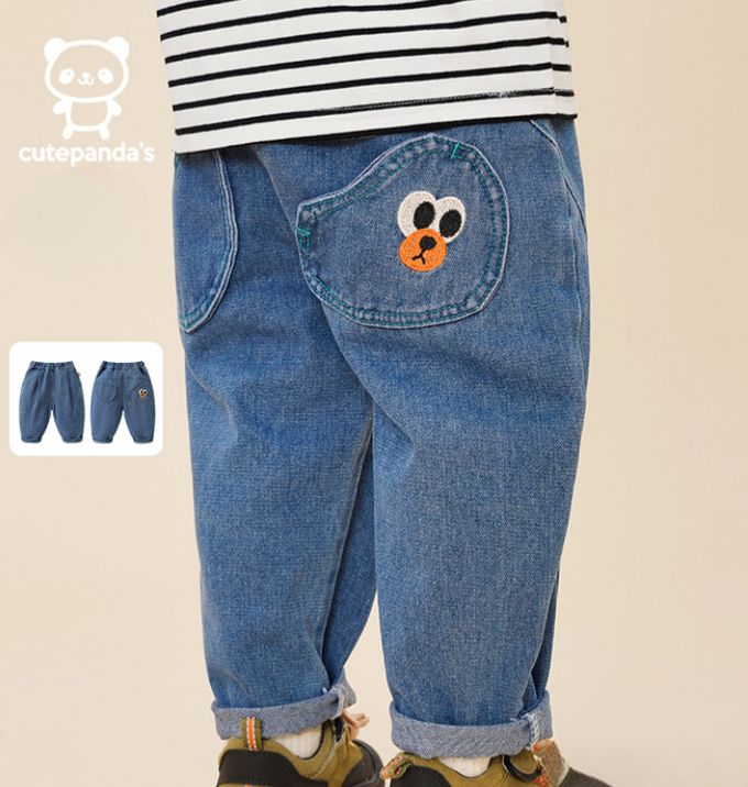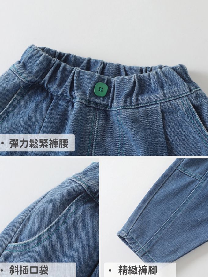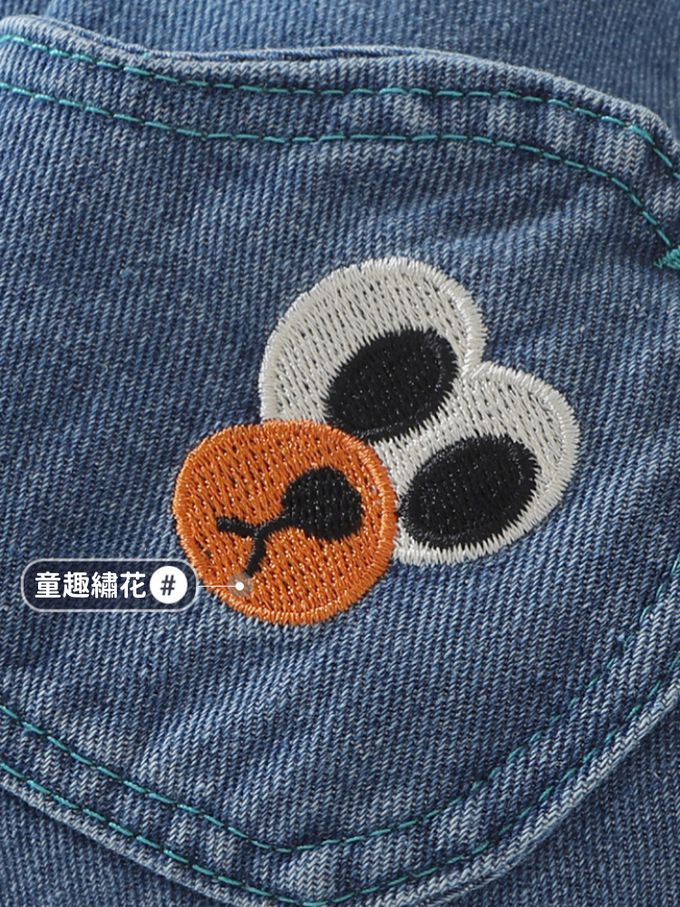 腰鬆緊率性牛仔長褲-口袋刺繡-藍色