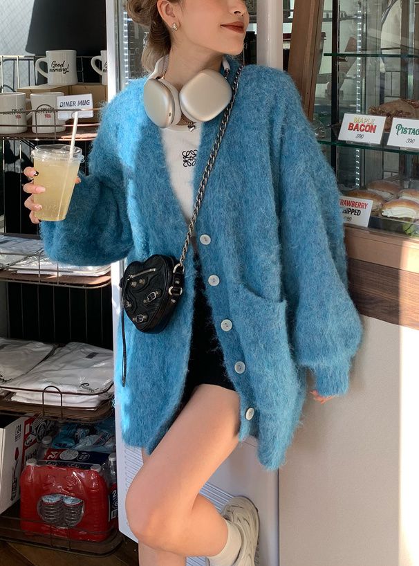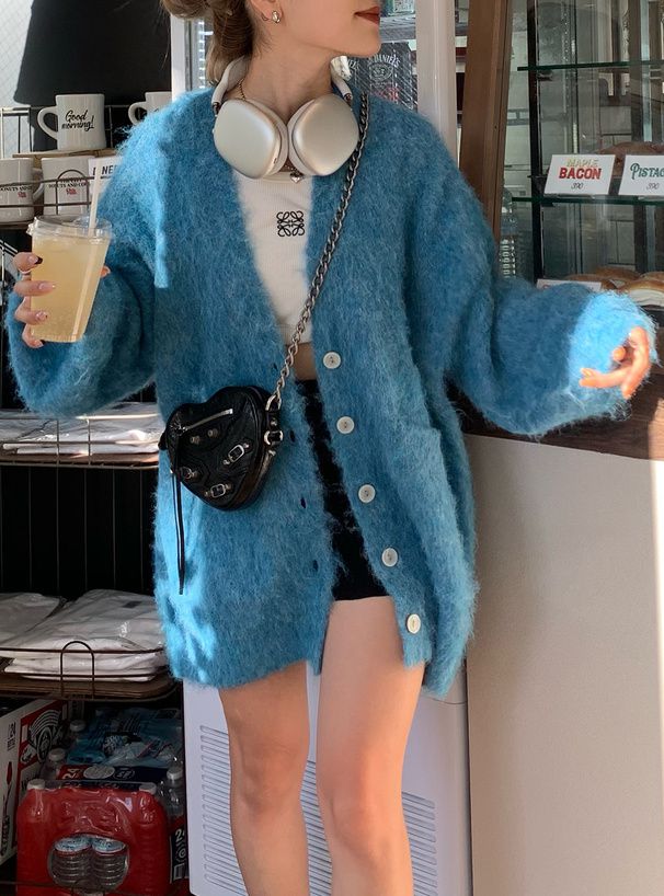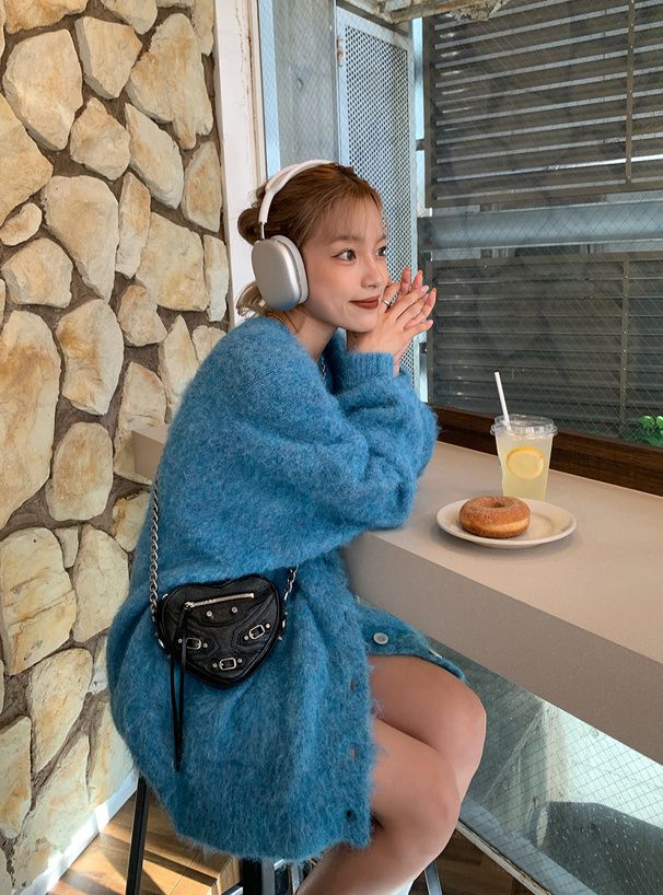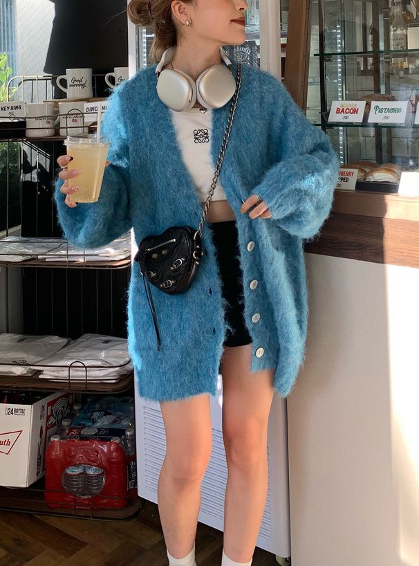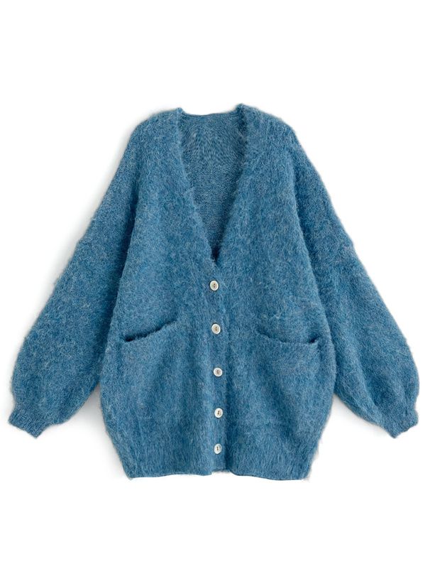 日本 GRL - 羊毛混紡蓬鬆長絨毛針織開襟外套-土耳其藍 (F)