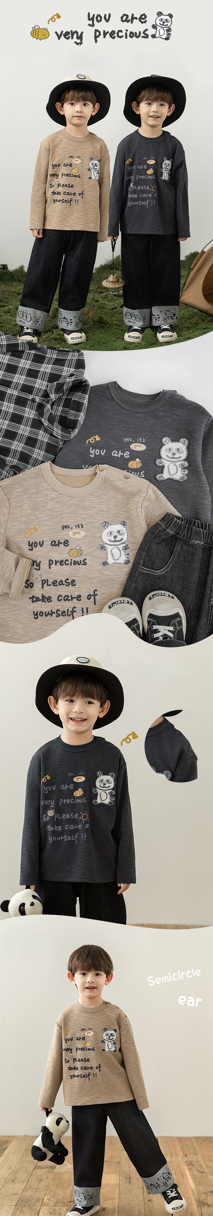 竹節棉休閒圓領長袖上衣-萌趣熊貓-卡其杏