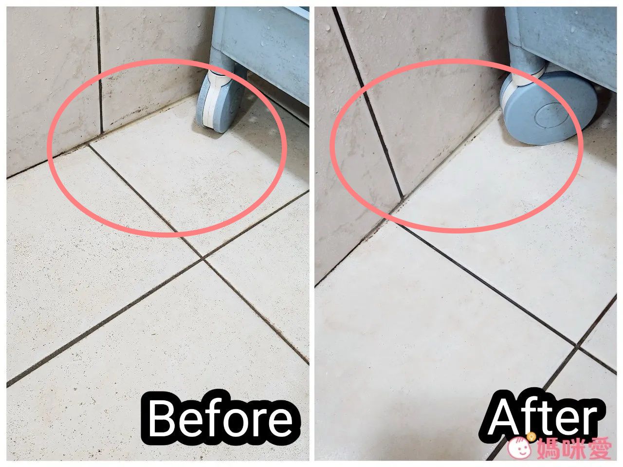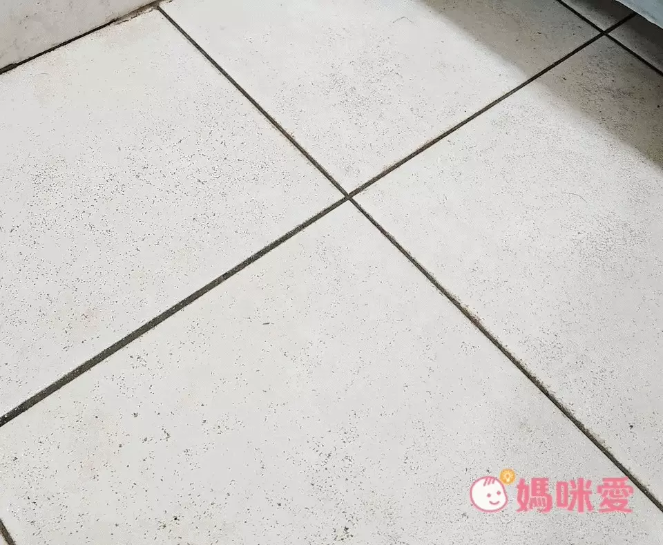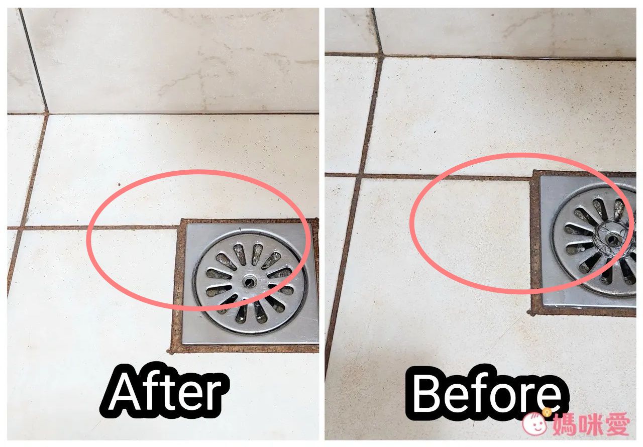 再來是濕氣很重的排水孔旁邊。有發現地磚的銜接縫隙顏色變淺了嗎?表示真的有效欸!