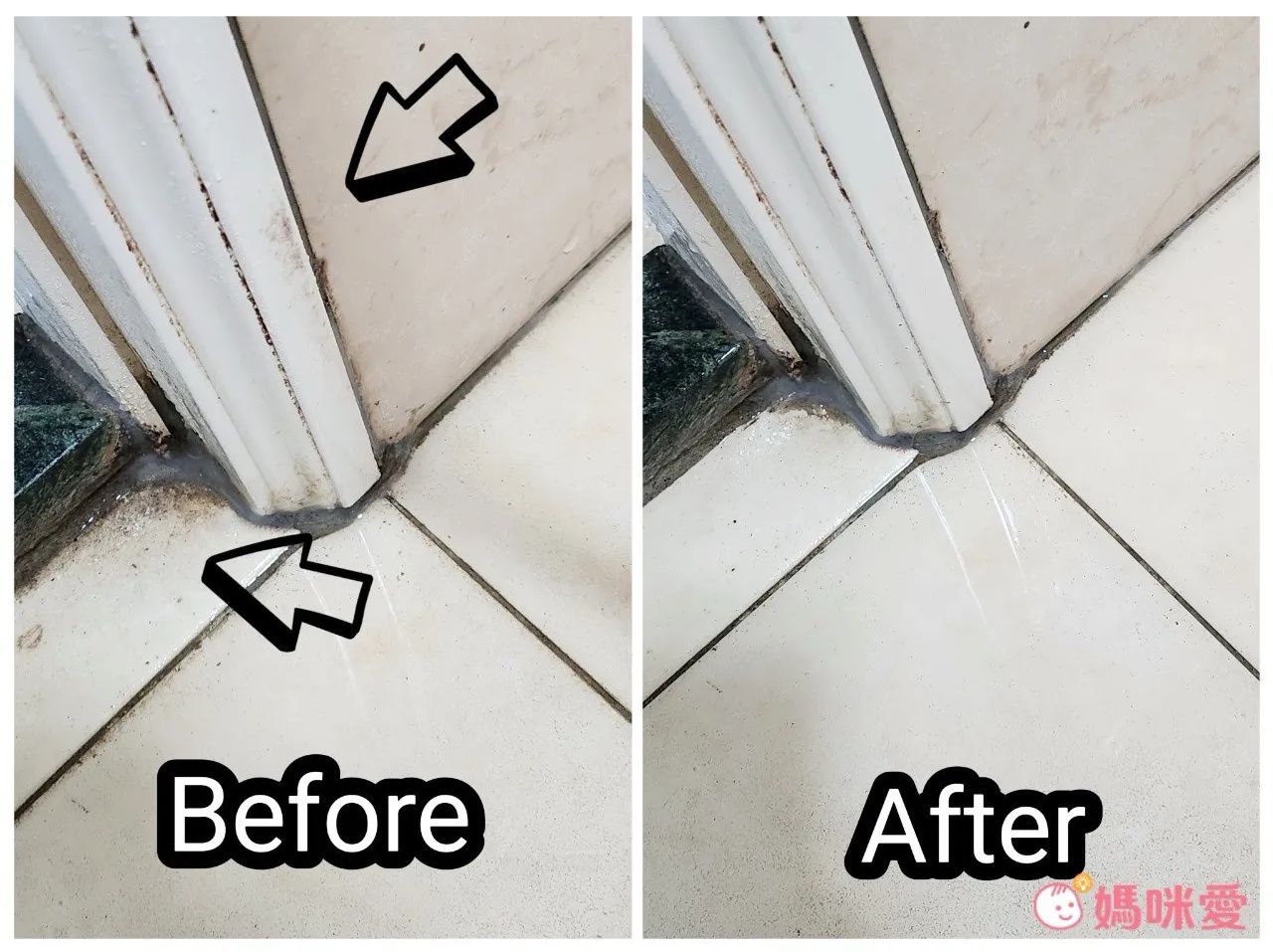 最後要考驗的是最黑的地方:浴室門檻&門檻邊邊。本來抱持著這罐可能跟一般普通清潔劑的效果一樣。沒想到❗沒花多少時間,它就將污漬降低到這樣程度!