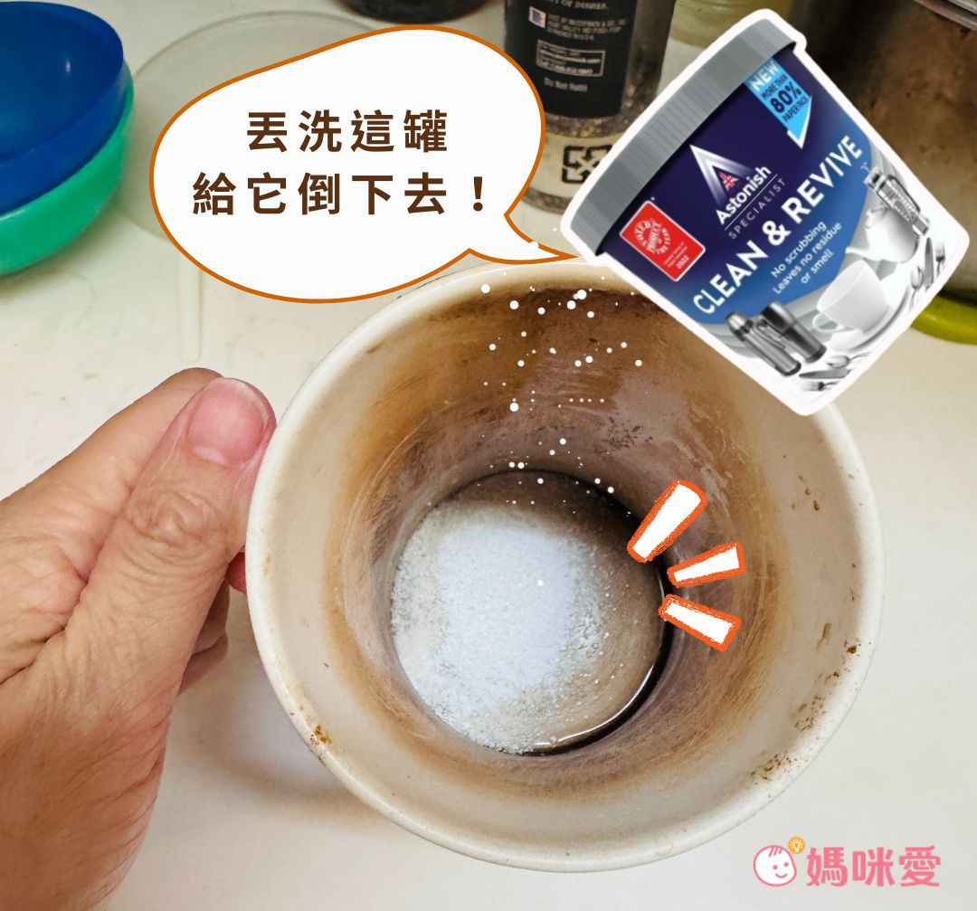 首先,在杯中加入二分之一湯匙的去污粉 (1湯匙約15-21g)。記得清潔杯子時要把杯子放在水槽或是瀝水板上哦,怕較劇烈的反應過程水可能會溢出💦