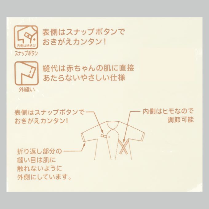 袖口及下擺等的縫線也設計在外側,不會直接接觸到小寶寶的肌膚。