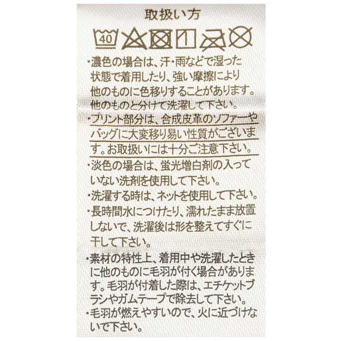 注意事項:●毛絮易燃,請勿靠近火源。●每個幼童的成長曲線有所不同,因此標示上的適用年齡僅供參考,請選擇適合幼童身型的商品。●請使用不含螢光增白劑的洗劑。●請使用洗衣網。●穿著時或洗滌時若毛絮沾到別的物品上,請用衣物用除毛刷或衣物用毛絮黏把清除。
