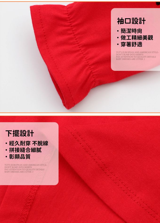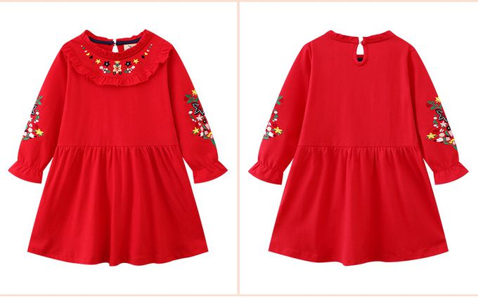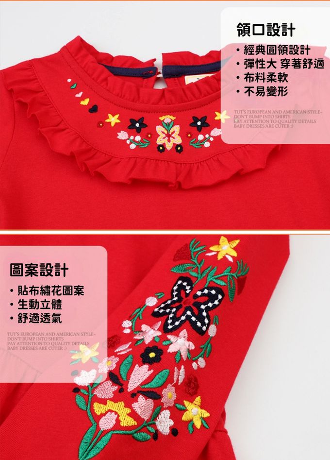 棉質荷葉邊長袖連身洋裝-貼布繡花-紅色