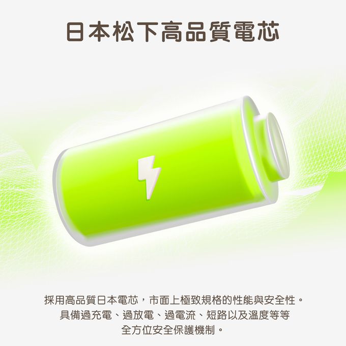 電芯種類/容量:日本松下鋰電芯;3.6V/5000mAh(18Wh)