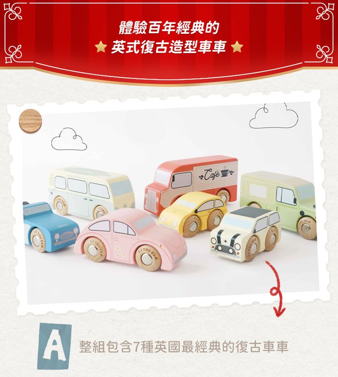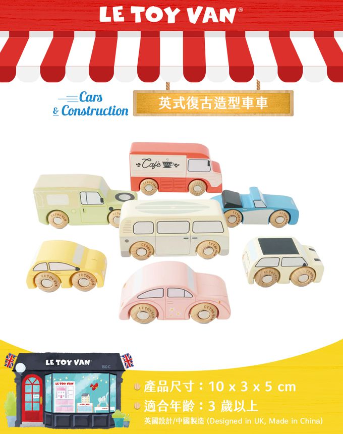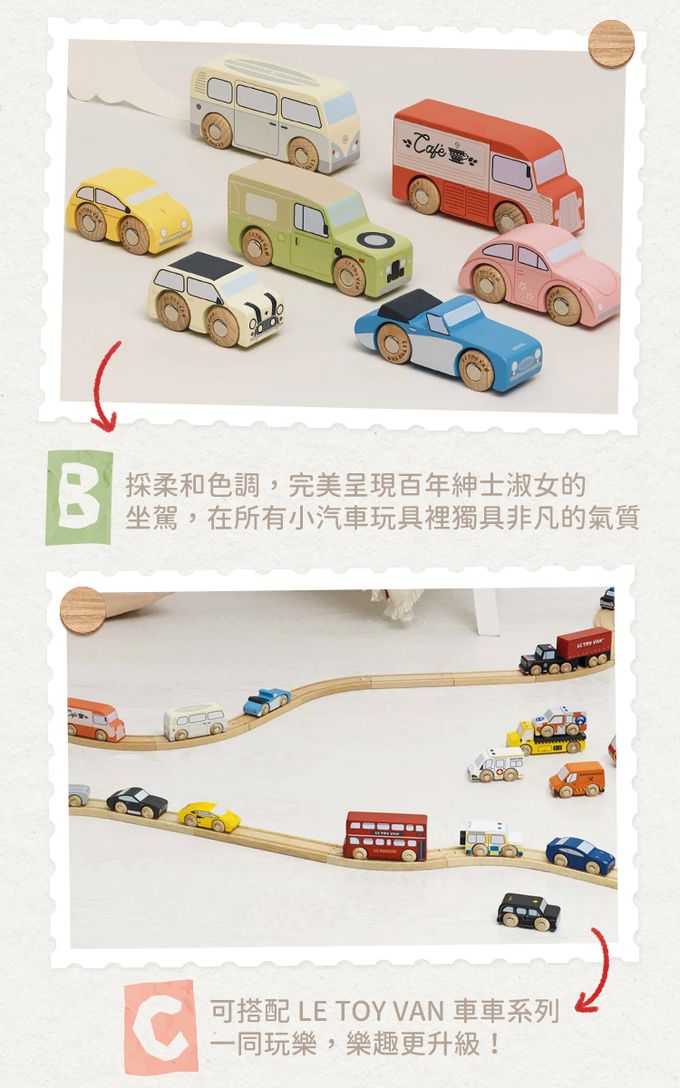 。體驗百年經典的英式復古造型車車。整組包含7種英國最經典的復古車車,採柔和色調,完美呈現百年紳士淑女的坐駕,在所有小汽車玩具裡獨具非凡的氣質。最天然純木質玩具 響應愛護地球無塑膠概念。使用永續性的純橡膠木實木材質,安全無毒且關心地球。採用天然無毒漆,確保絕對的安全性。尺寸為: 10 x 3 x 5 cm。適合年齡: 3 歲以上。英國設計, 中國製造 (Designed in UK, Made in China)