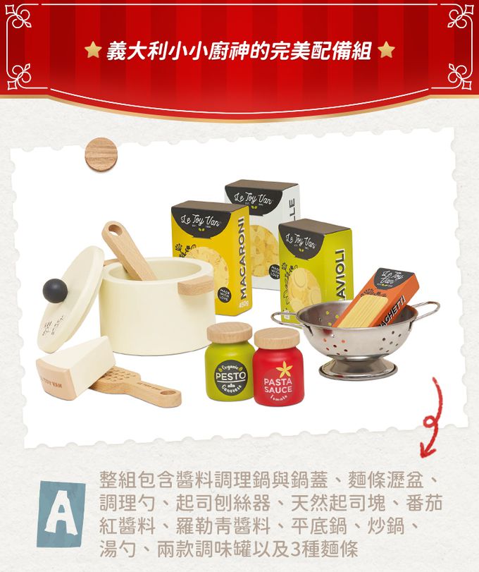 。整組包含醬料調理鍋與鍋蓋、麵條瀝盆、調理勺、起司刨絲器、天然起司塊、番茄紅醬料、羅勒青醬料、平底鍋、炒鍋、湯勺、兩款調味罐以及3種麵條