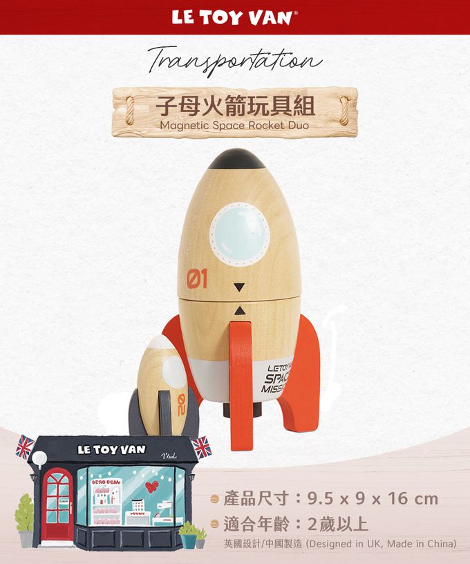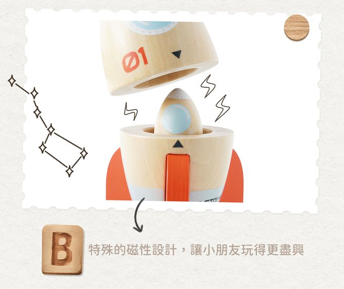 。子母設計,在大火箭裡藏著一個蓄勢待發的小火箭,特殊的磁性設計,讓小朋友玩得更盡興