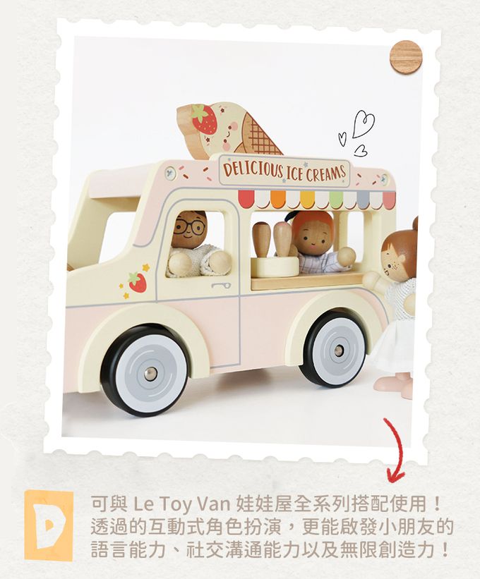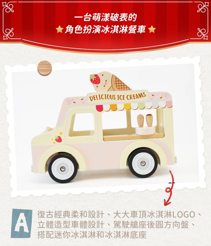 。復古經典柔和設計、大大車頂冰淇淋LOGO、立體造型車體設計、駕駛艙座後圓方向盤、餐車區的多種冰淇淋口味、搭配迷你冰淇淋和冰淇淋底座