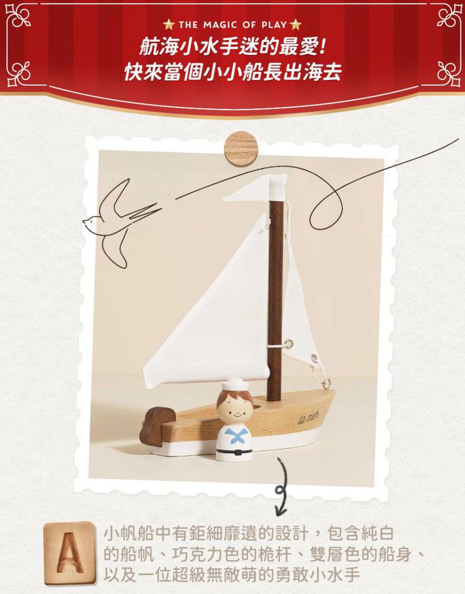 。小帆船中有鉅細靡遺的設計,包含純白的船帆、巧克力色的桅杆、雙層色的船身、以及一位超級無敵萌的勇敢小水手