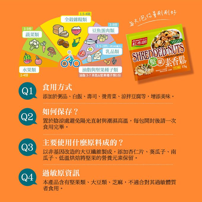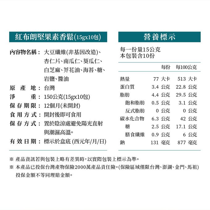 過敏原:本產品含有堅果類、大豆類、芝麻,不適合對其過敏體質者食用。