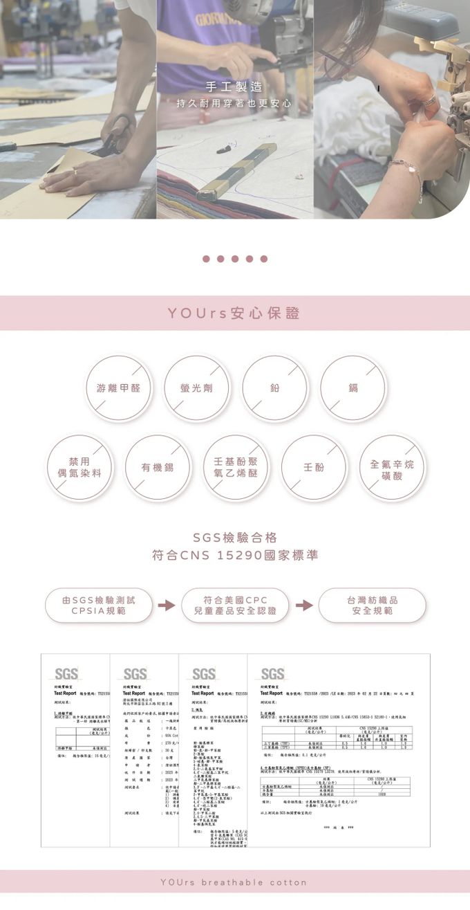 產品相關安全檢驗報告:產品經SGS測試 通過CNS 15290嬰兒紡織規範 符合美國CPSIA規範 產品不含有毒物質 不含甲醛、重金屬、螢光劑 國家標檢局檢驗合格 BSMI:M3E255
