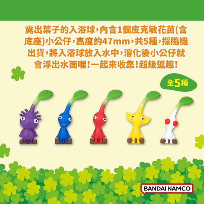 內含1個皮克敏花苗(含底座)小公仔,高度約47mm,共5種,採隨機出貨,將入浴球放入水中,溶化後小公仔就會浮出水面喔!