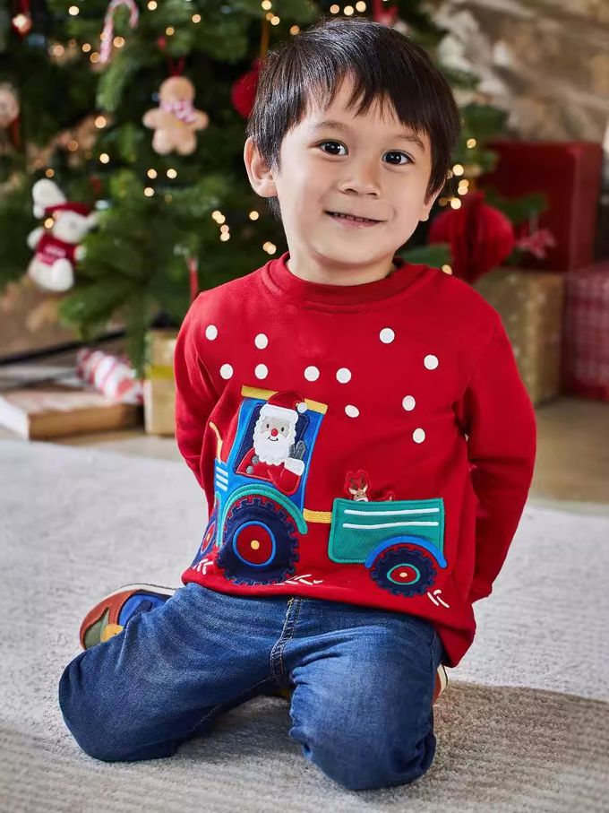 圓領棉質長袖上衣/大學T-聖誕老人坐車車-紅色