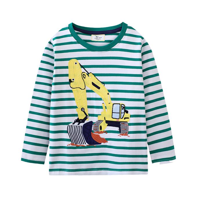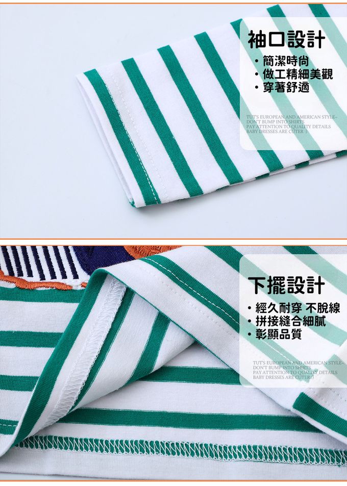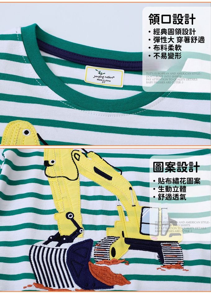 圓領棉質長袖上衣-挖土機貼布繡-綠色條紋