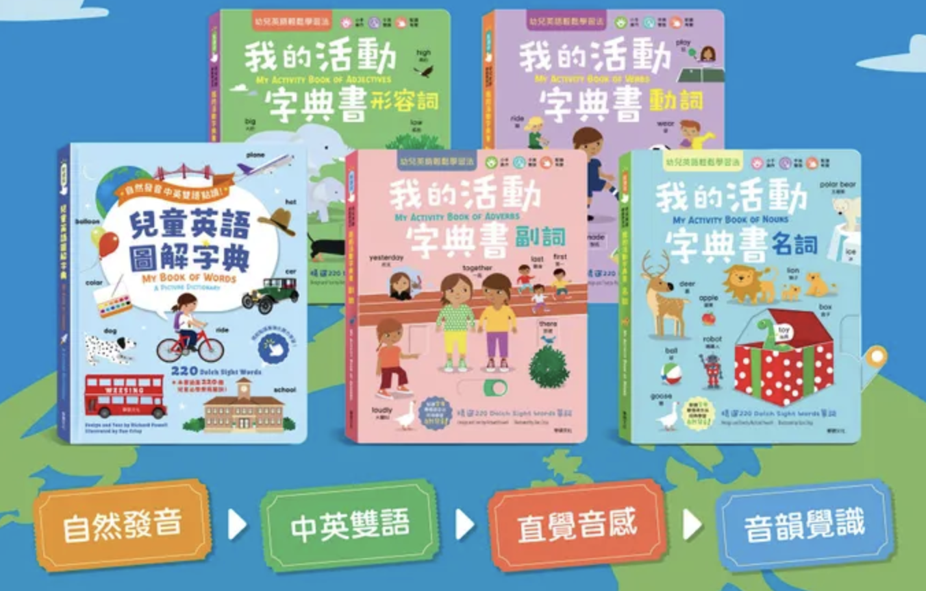 想要英文基礎打好,這五本一個都不能少❗其中四本是四大詞性分類的濃縮精華:名詞、動詞、形容詞、副詞。而另一本是專為『非英語系國家幼兒』所設計的英語圖解字典。