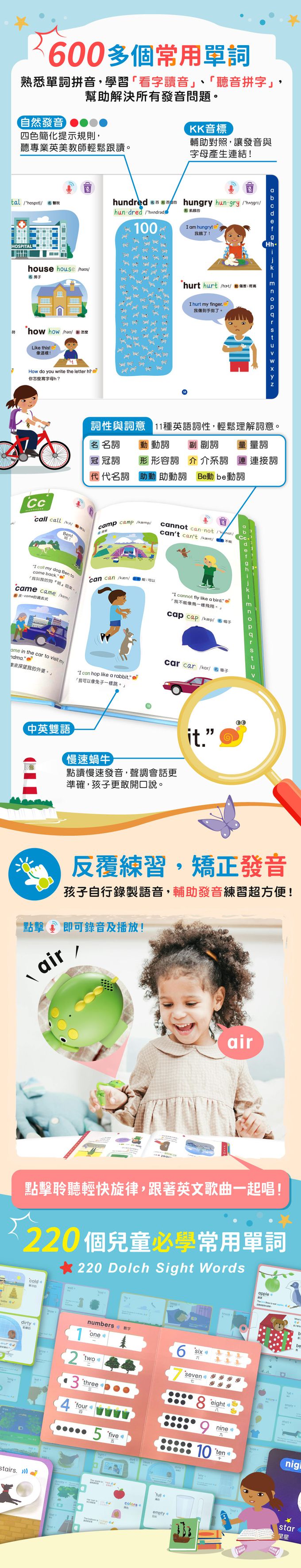 裡頭的資訊量也是非常豐富,從自然發音、聽聽唸法、錄音功能、英文短句,讓孩子清楚知道用法以及矯正發音。