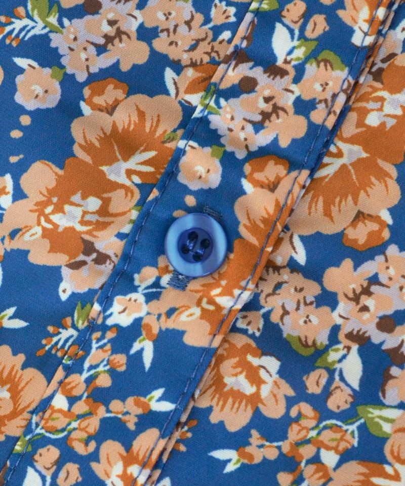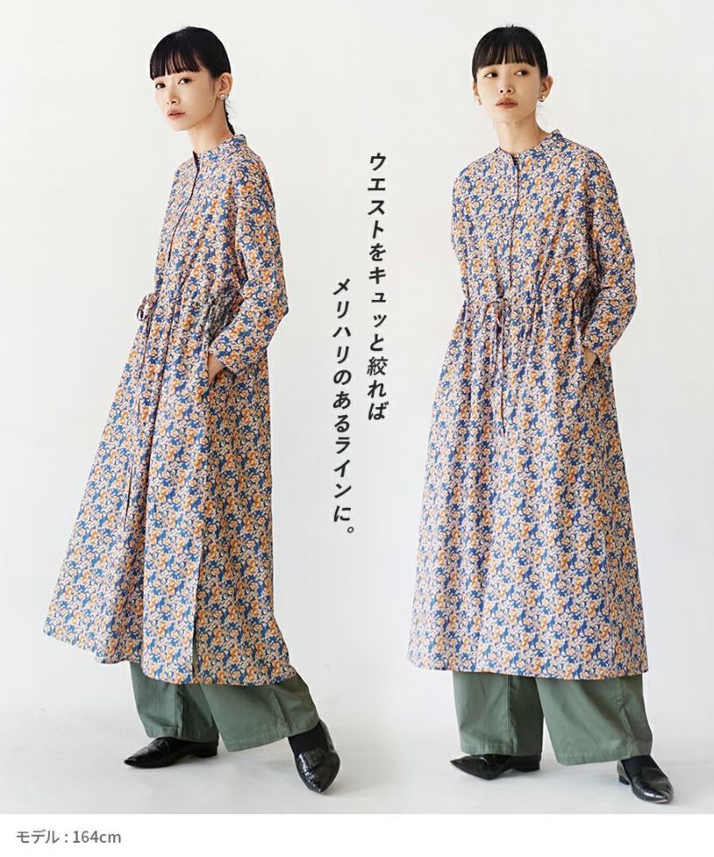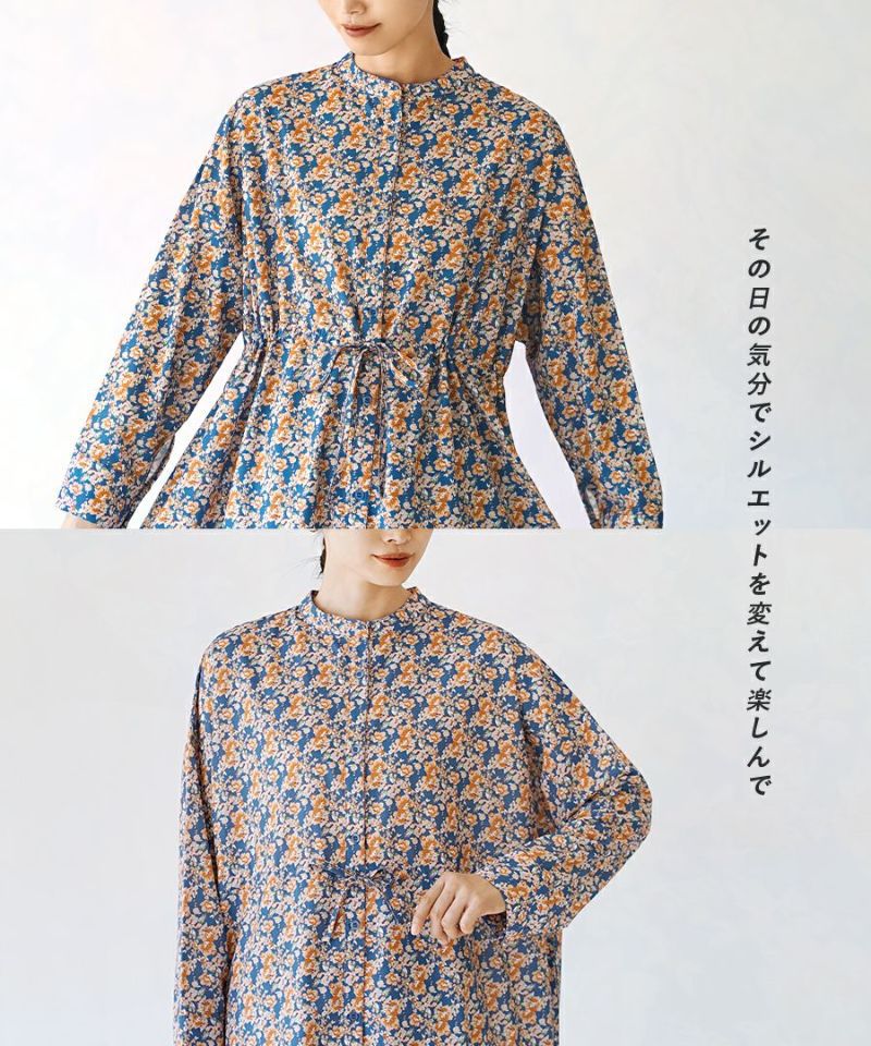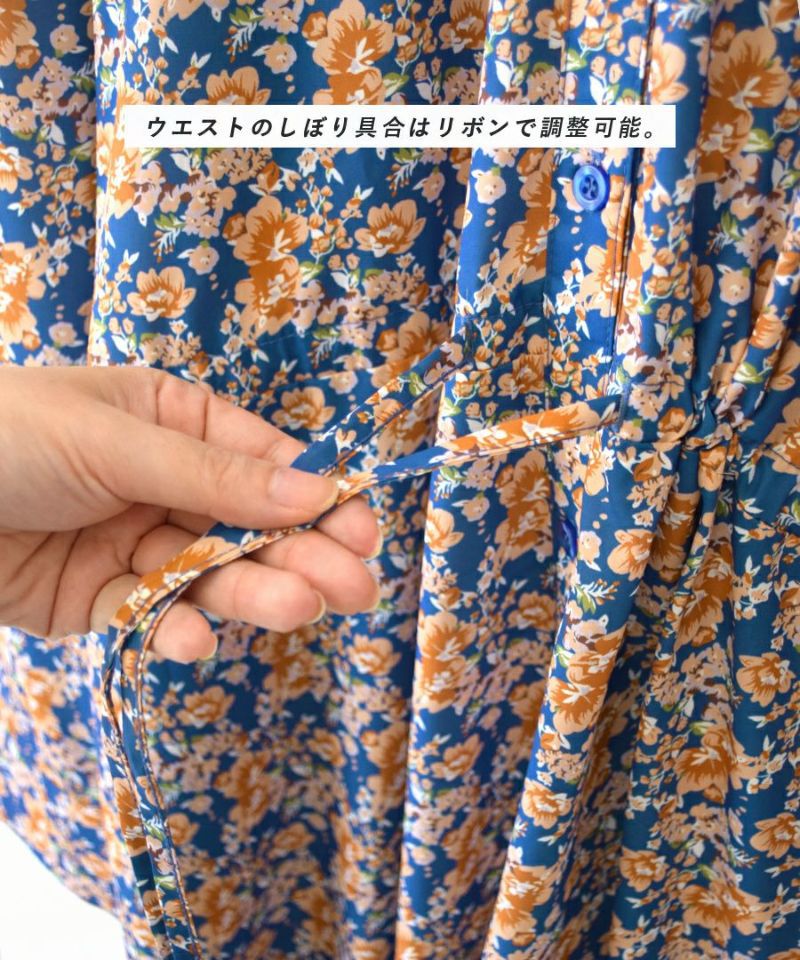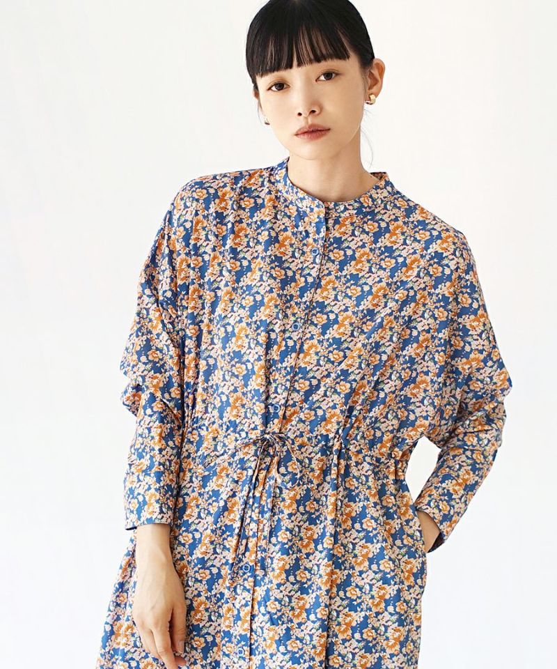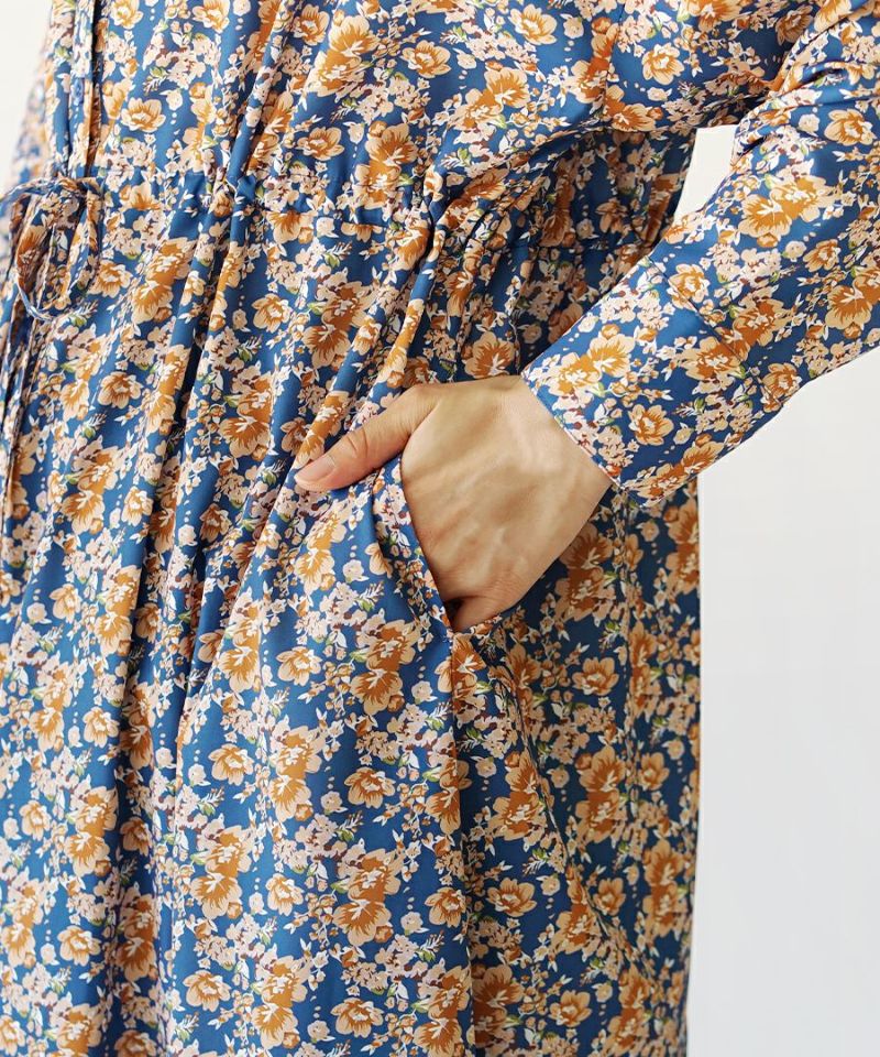 搶眼滿版花腰抽繩長袖襯衫式洋裝