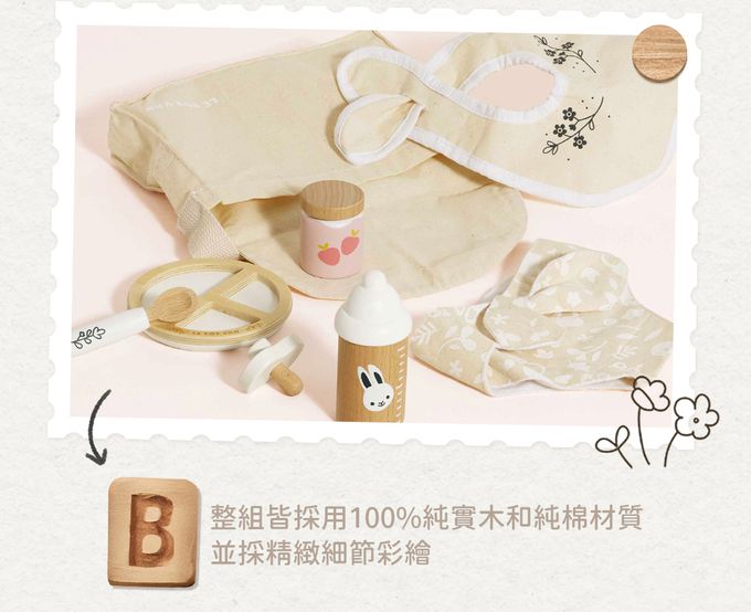 。一個精緻帆布照護包,內有7件Baby娃娃專屬的貼身物,包含圍兜兜、奶嘴、奶瓶、尿布、餐盤、湯匙、娃娃果泥等